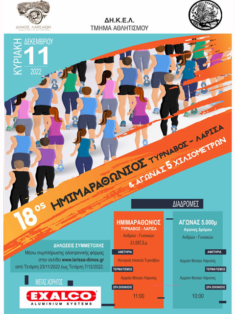 Την Κυριακή 11 Δεκεμβριου ο 18ος Hμιμαραθώνιος δρόμος «ΤΥΡΝΑΒΟΣ-ΛΑΡΙΣΑ» και αγώνας δρόμου 5 χλμ.