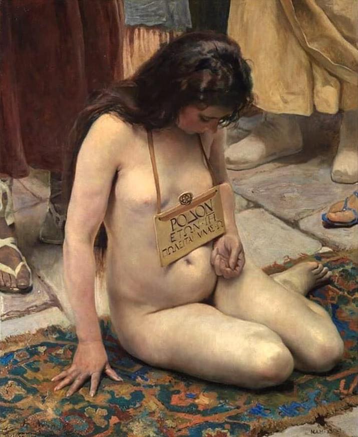 Ελληνίδα σκλάβα προς πώληση σε αγορά της Ανατολής, εντελώς γυμνή, πάνω σε ένα χαλί.