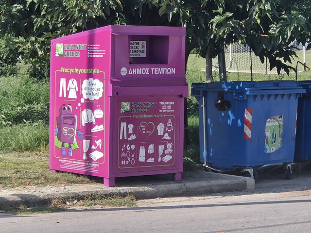 Μωβ κάδοι ανακύκλωσης ρούχων και υποδημάτων στο Δήμο Τεμπών