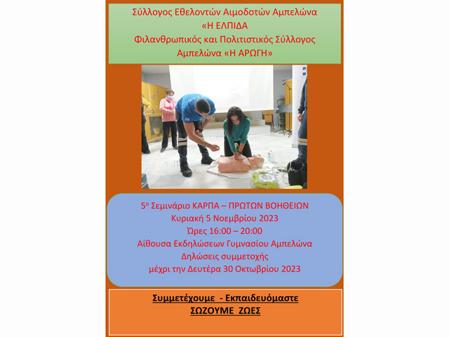 Σύλλογος Εθελοντών Αιμοδοτών Αμπελώνα ¨Η ΕΛΠΙΔΑ¨ και Φιλανθρωπικός & Πολιτιστικός Σύλλογος Αμπελώνα ¨Η ΑΡΩΓΗ¨: 2ο Σεμινάριο Πρώτων Βοηθειών – ΚΑΡΠΑ
