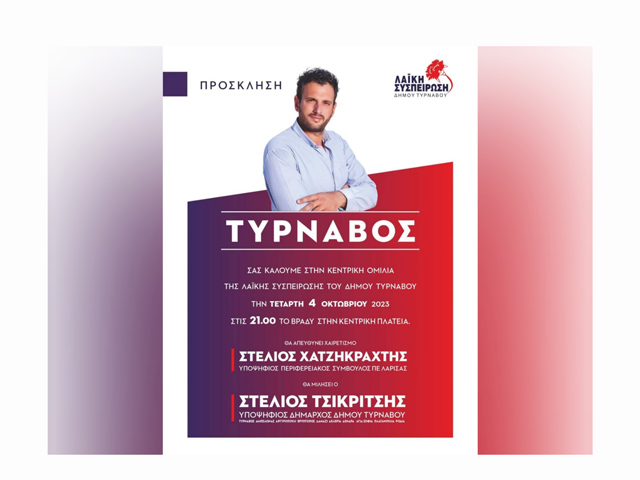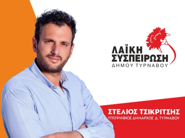 Σήμερα Τετάρτη στις 21:00 στον Τύρναβο η κεντρική ομιλία του υποψήφιου δημάρχου Στέλιου Τσικριτσή