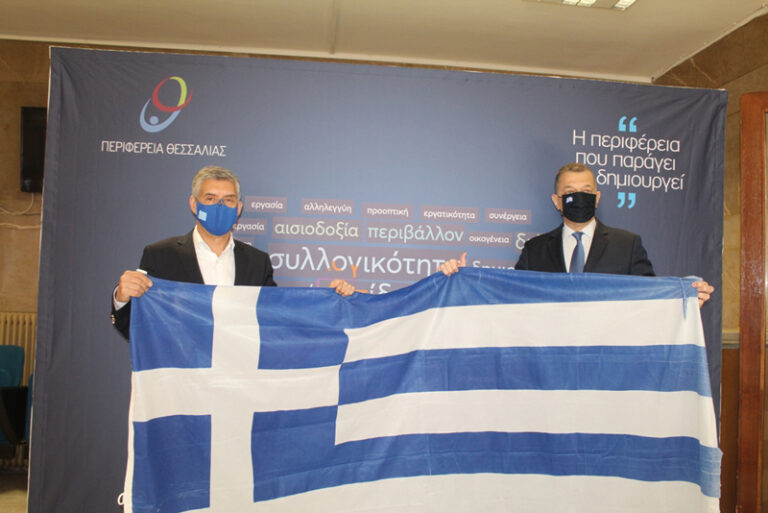 Η σημαία της νησίδας Στρογγύλη, παραδόθηκε από τον Υφυπουργό Εθνικής Άμυνας Αλκιβιάδη Στεφανή στον Περιφερειάρχη Θεσσαλίας Κώστα Αγοραστό