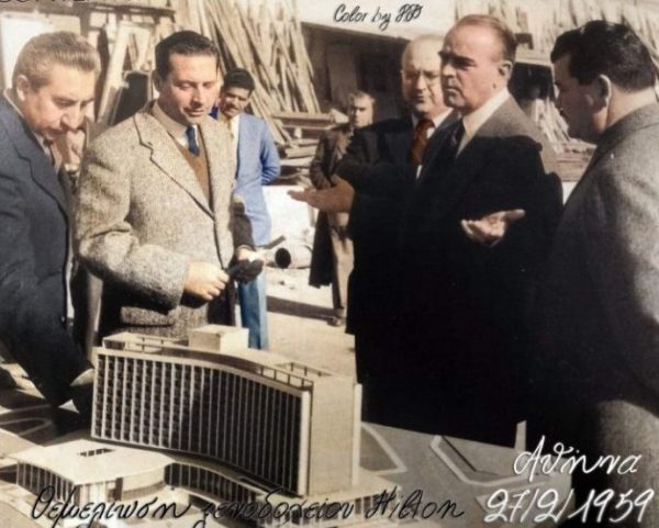 Θεμελιώνεται στην Αθήνα από τον πρωθυπουργό Κωνσταντίνο Καραμανλή το ξενοδοχείο «Χίλτον». Επεξεργασία φωτογραφίας Πασχάλης Δημάκης