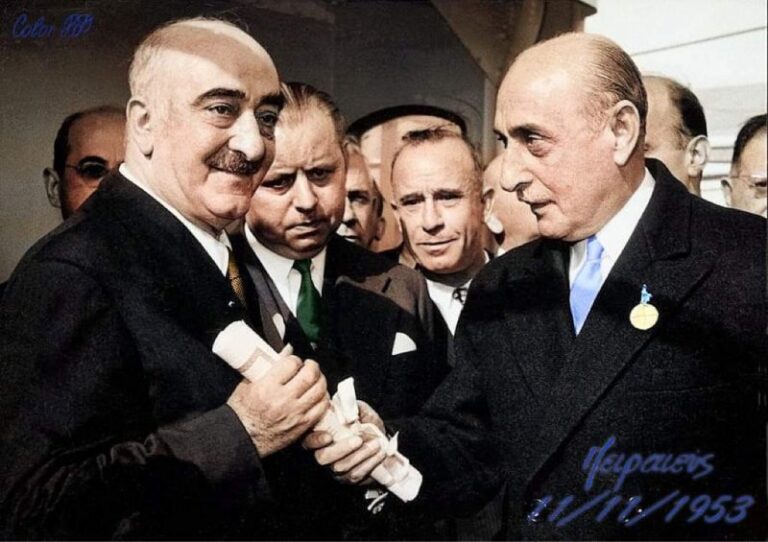 Ο Πρωθυπουργός Αλέξανδρος Παπάγος με τον Πλοιοκτήτη Ευγένιο Ευγενίδη – Επεξεργασία Φωτογραφίας Πασχάλης Δημάκης