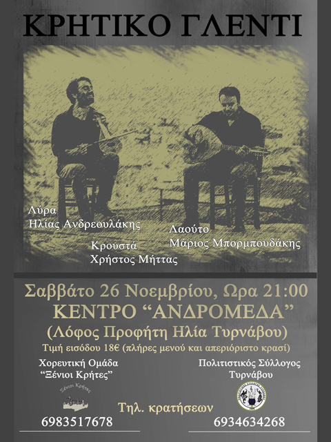 Ο Πολιτιστικός Σύλλογος Τυρνάβου και η Χορευτική Ομάδα «Ξένιοι Κρήτες» διοργανώνουν Κρητικό Γλέντι