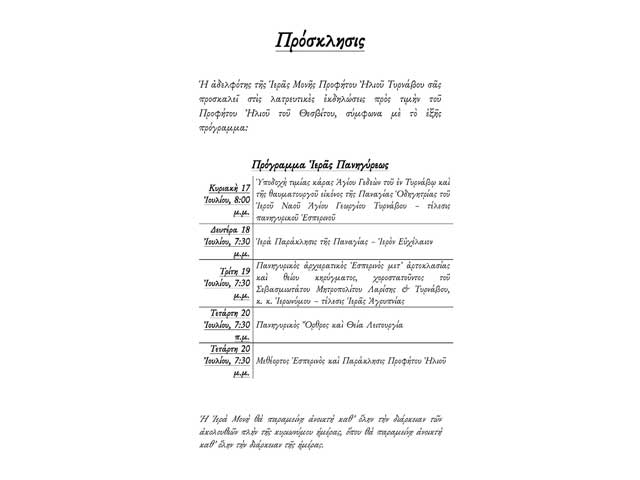 Πρόγραμμα Ιεράς Πανηγύρεως του Προφήτου Ηλιού του Θεσβίτου Τυρνάβου