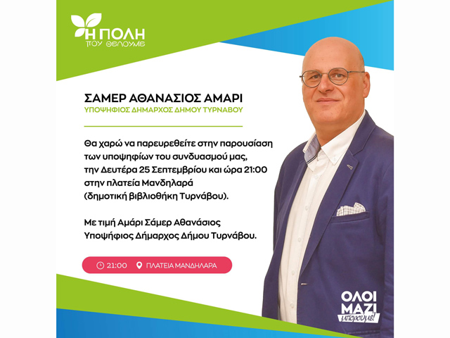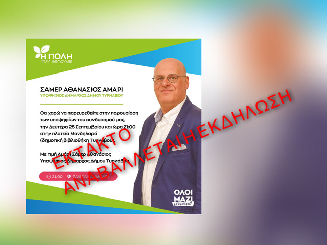Αναβάλλεται η εκδήλωση του υποψήφιου δημάρχου Τυρνάβου Σάμερ Αθανάσιος Αμάρι