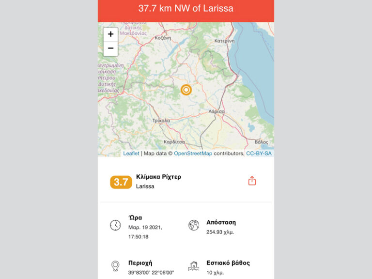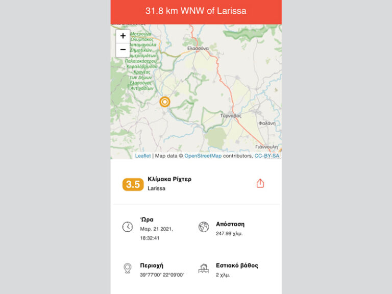 Ασθενής σεισμική δόνηση 3.4 βαθμών της κλίμακας ρίχτερ στις 20:05 στην Ελασσόνα