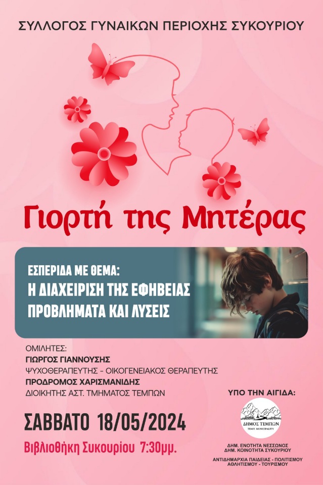 Ο Σύλλογος Γυναικών περιοχής Συκουρίου, διοργανώνει Εσπερίδα με θέμα: “Η διαχείριση της εφηβείας-Προβλήματα και Λύσεις”