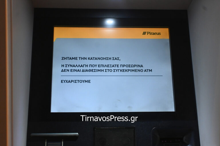 Χωρίς μετρητά το ΑΤΜ της Τράπεζας Πειραιώς στον Τύρναβο – Πρόβλημα εν μέσω του εορταστικού τριημέρου