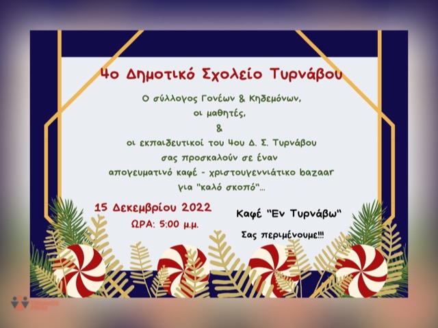 Χριστουγεννιάτικο Bazaar του 4ου Δημοτικού Σχ. Τυρνάβου στο Εν Τυρνάβω την Πέμπτη 15 Δεκεμβρίου