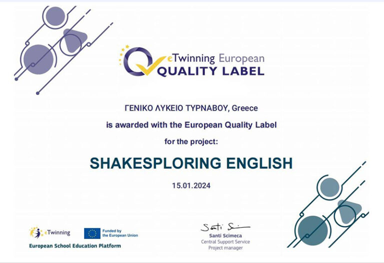Ευρωπαϊκή Eτικέτα Ποιότητας Ε-twinning για το ΓΕΛ Τυρνάβου