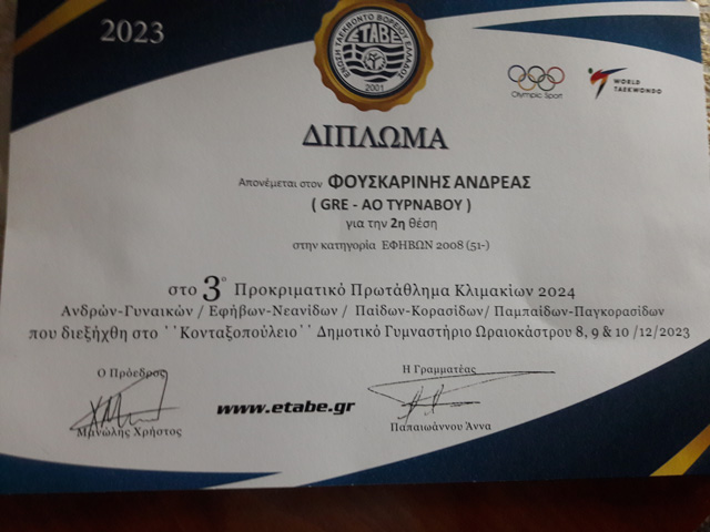 ΓΕΛ Τυρνάβου: Συγχαρητήρια στον μαθητή Φουσκαρίνη Ανδρέα για την 2η θέση στο 3ο Προκριματικό Πρωτάθλημα Κλιμακίων
