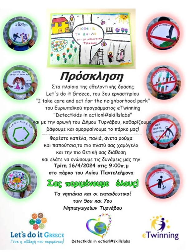 5ο και 7ο Νηπιαγωγεία Τυρνάβου: Πρόσκληση στην εθελοντική δράση ”Καθαρισμός πάρκου Αγίου Παντελεήμονα”