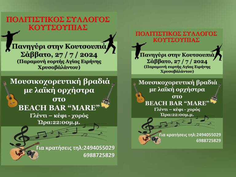 Ο Πολιτιστικός Σύλλογος Κουτσουπιάς διοργανώνει μουσικοχορευτική βραδιά παραμονή της εορτής της Αγίας Ειρήνης Χρυσοβαλάντου