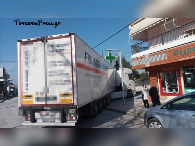 Φορτηγό «σφήνωσε» σε στροφή στον Αμπελώνα