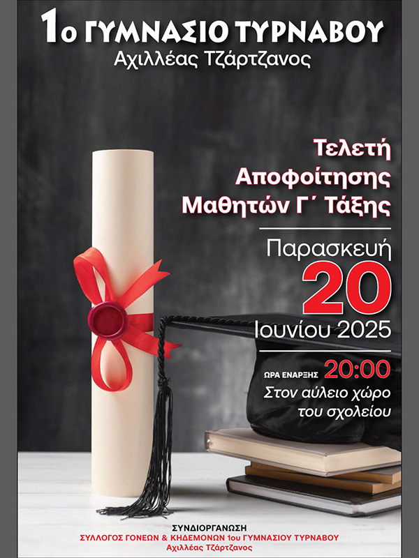 Με ιδιαίτερη χαρά και συγκίνηση, το 1ο Γυμνάσιο Τυρνάβου «Αχιλλέας Τζάρτζανος» ετοιμάζεται να αποχαιρετήσει τους μαθητές της Γ’ τάξης με μια όμορφη τελετή αποφοίτησης, την Παρασκευή 20 Ιουνίου 2025 και ώρα 20:00, στο Κλειστό Γυμναστήριο Τυρνάβου.