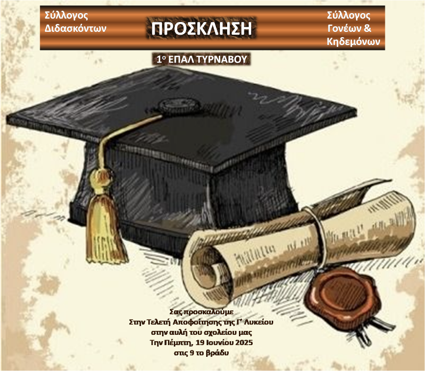 Την Πέμπτη 19 Ιουνίου 2025 στις 09:00 το βράδυ θα γίνει η Τελετή Αποφοίτησης στην αυλή του 1ου ΕΠΑΛ Τυρνάβου.