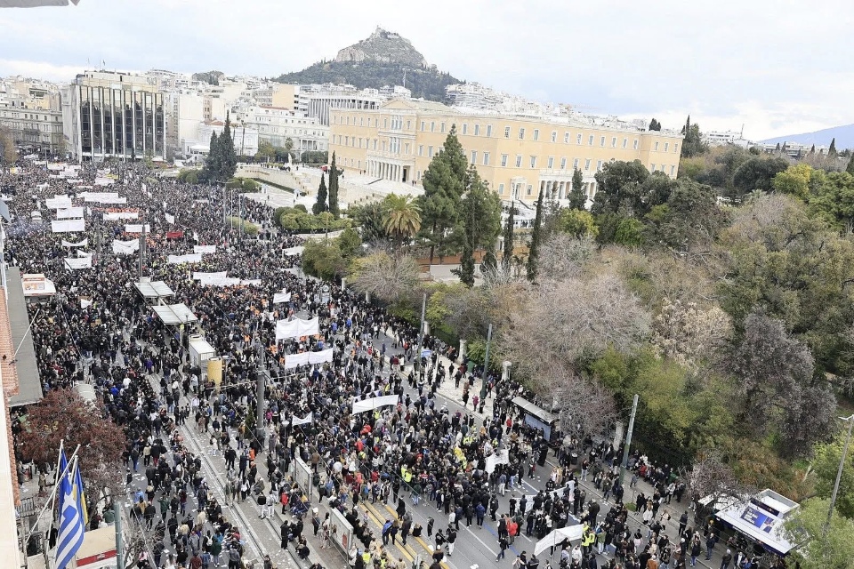 Πλημμύρισε από κόσμο το Σύνταγμα στην μεγαλειώδη συγκέντρωση για τα δύο χρόνια από την τραγωδία στα Τέμπη με τους 57 νεκρούς.