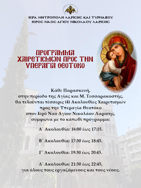 Κάθε Παρασκευή, στην περίοδο της Αγίας και Μ. Τεσσαρακοστής, θα τελούνται τέσσερις (4) Ακολουθίες Χαιρετισμών προς την Υπεραγία Θεοτόκο στον Ιερό Ναό Αγίου Νικολάου Λαρίσης, σύμφωνα με το κάτωθι πρόγραμμα: