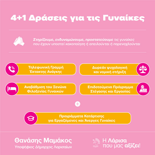 Στο πλαίσιο αυτό, η «Λάρισα που μας αξίζει!» καταθέτει πλέγμα 4+1 δράσεων για τη στήριξη, ενδυνάμωση και προστασία των γυναικών που είτε έχουν υποστεί κακοποίηση, ή απειλούνται ή παρενοχλούνται:
