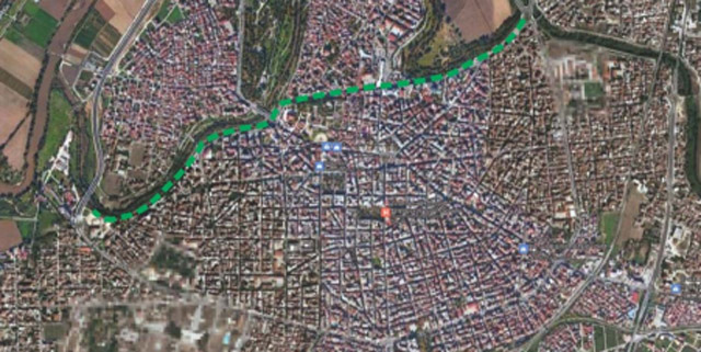 Από την οδό Αεροδρομίου μέχρι την οδό Τ.Τσιόγκα (πρώην Καλλιθέας) σχεδιάζεται μια συνολική ανάπλαση για την δημιουργία μιας παραποτάμιας εσπλανάδας, που θα περιλαμβάνει χρήσεις αναψυχής και θα αποτελέσει το νέο κέντρο της πόλης. Με τον τρόπο αυτό η κάτω κοίτη μένει ανέπαφη με ήπιες διαμορφώσεις -πράσινος δακτύλιος, ενώ στο επίπεδο της πόλης λειτουργεί ένας μεγάλος παραποτάμιος περίπατος με εμπορικές και ψυχαγωγικές χρήσεις.