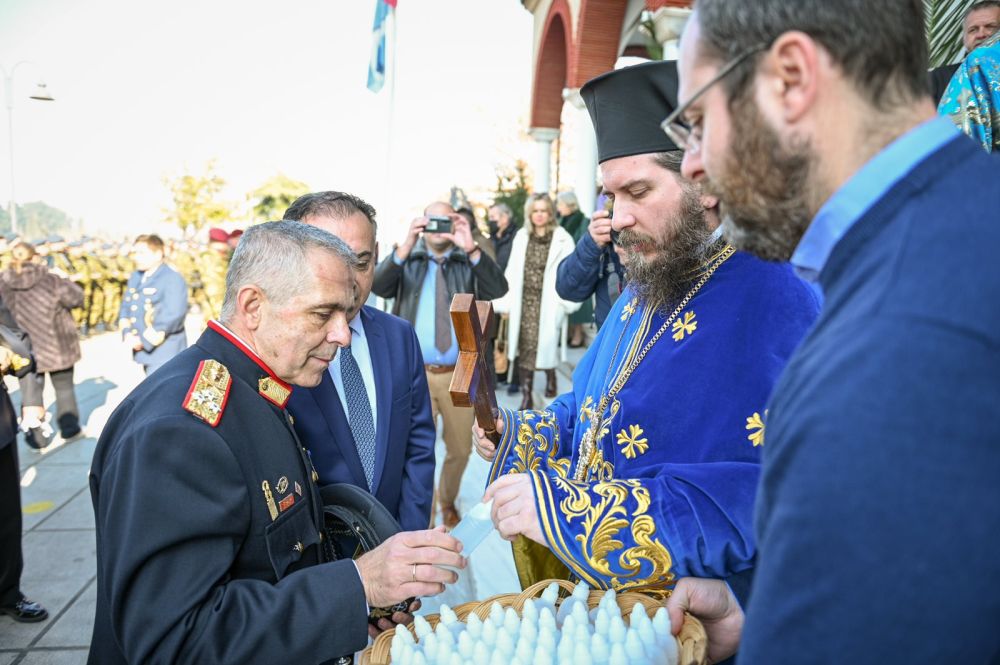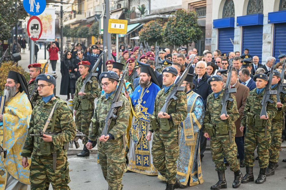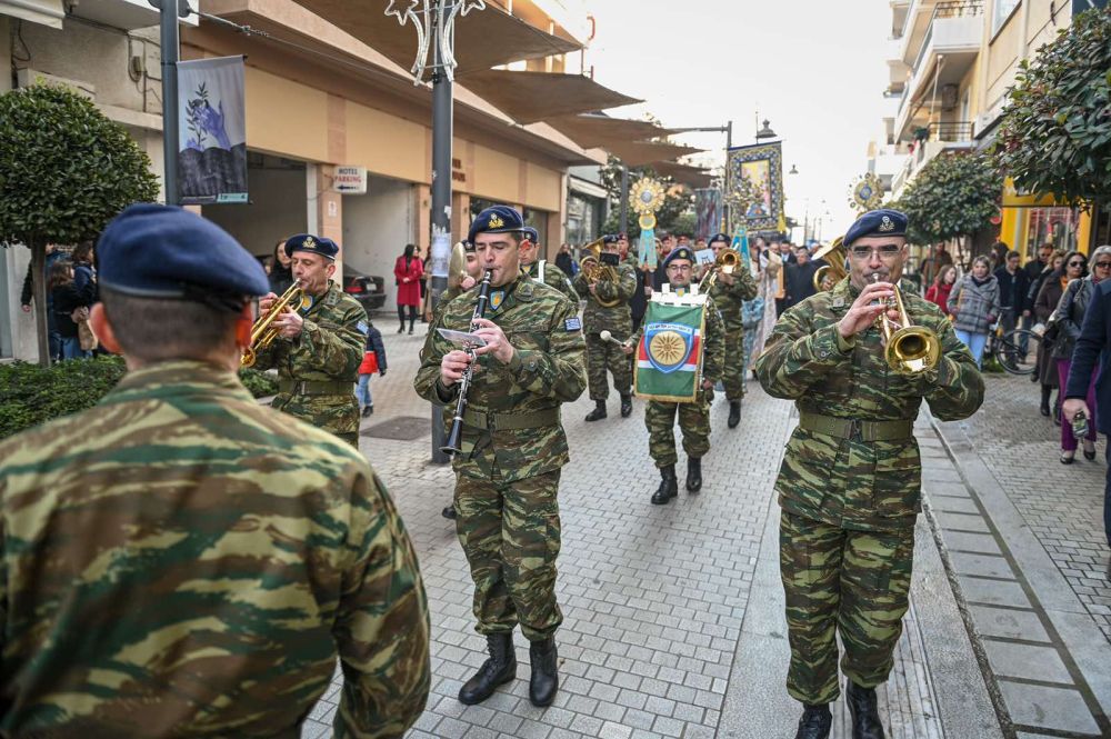 Μετά την τέλεση του Αγιασμού, ακολούθησε λιτανευτική πομπή, παρουσία των Πολιτικών και Στρατιωτικών Αρχών της πόλεως μας και πραγματοποιήθηκε η ρίψη του Τιμίου Σταυρού στον Πηνειό.