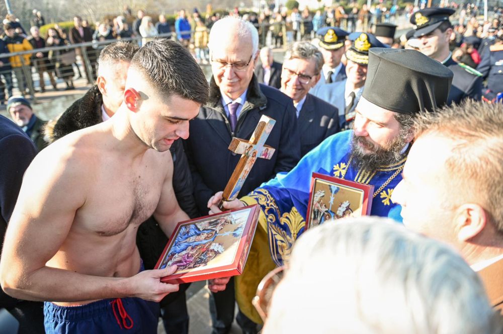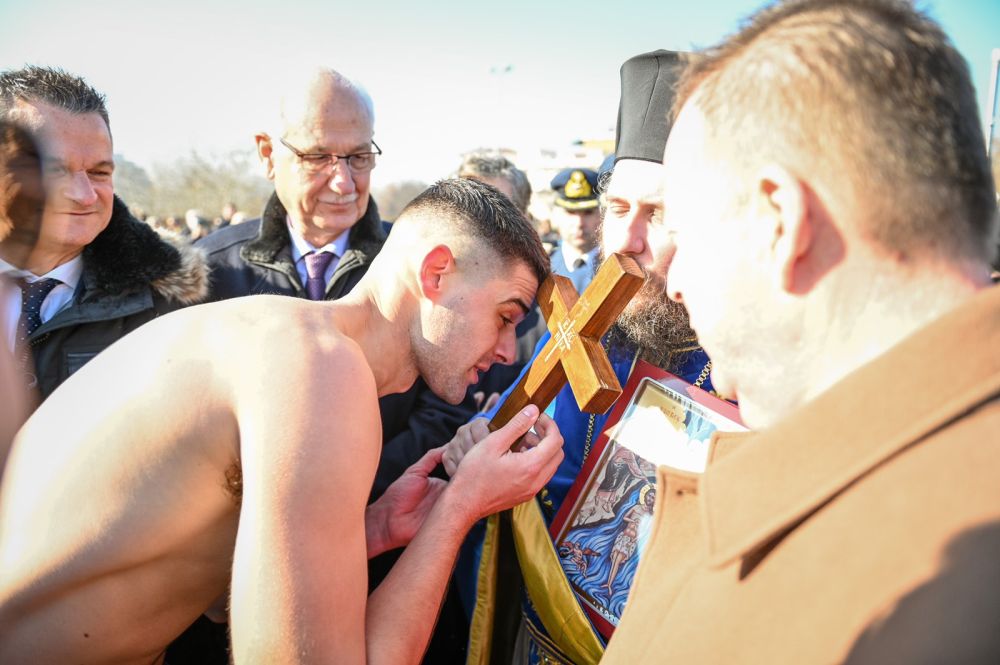 Ανάμεσα στους 12 κολυμβητές που έπεσαν για να ανασύρουν τον Σταυρό από τα παγωμένα νερά του ποταμού, ο κ. Ιωάννης Ζιώγας, αξιωματικός στρατού ξηράς στο βαθμό του ανθυπολοχαγού, ήταν εκείνος που τον ανέσυρε πρώτος και έλαβε ως ευλογία μία εικόνα της Βαπτίσεως του Κυρίου μας.