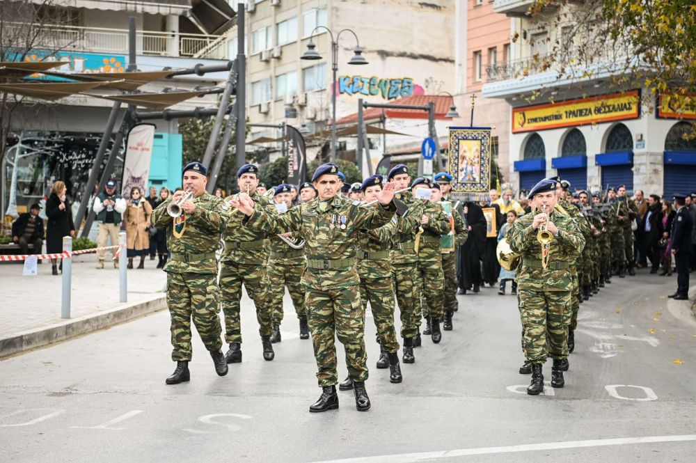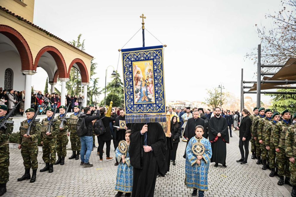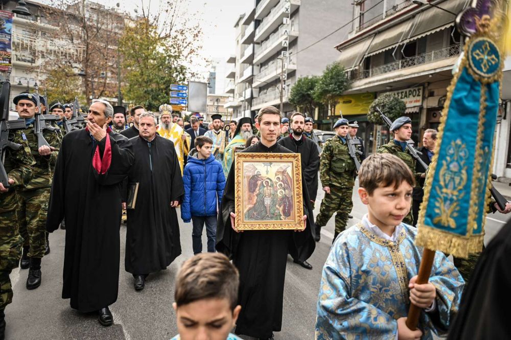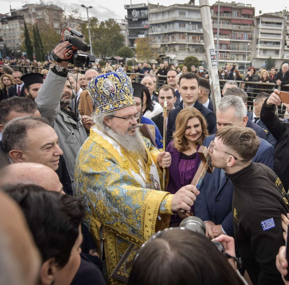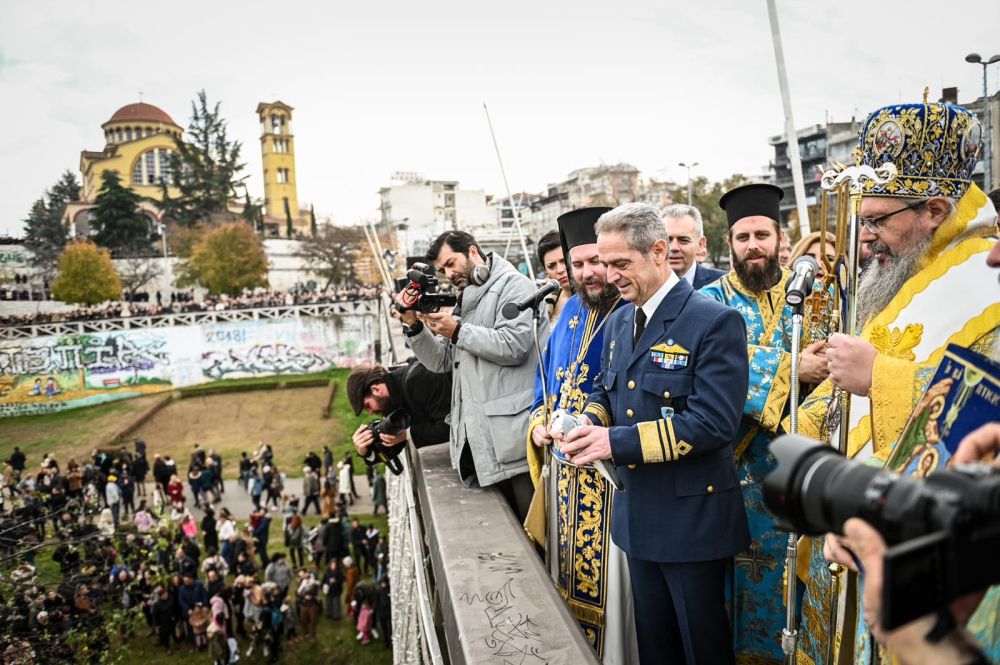 Αργότερα, υπό τους ήχους της φιλαρμονικής του δήμου Λαρισαίων και συνοδευόμενη από στρατιωτικό άγημα, η πομπή μεταφέρθηκε στη γέφυρα του Πηνειού, όπου πραγματοποιήθηκε η κατάδυση του Τιμίου Σταυρού.