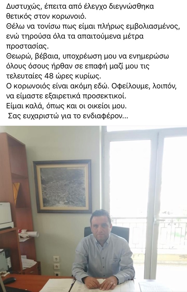 Με δική του ανάρτηση στα μέσα κοινωνικής δικτύωσης ο αντιδήμαρχος Τεχνικών έργων και Πολεοδομίας του Δήμου Τυρνάβου Γιώργος Σακούτσιος κάνει γνωστό στους συμπολίτες μας πως βρέθηκε θετικός στον κορωνοιό αν και είναι πλήρως εμβολιασμένος.