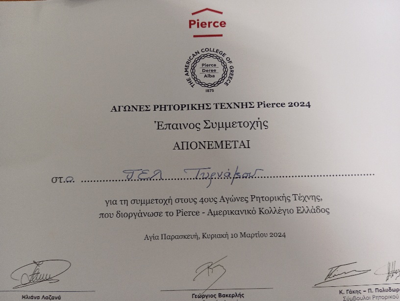 Το σχολείο μας και τη φετινή σχολική χρονιά συμμετείχε στους Αγώνες Ρητορικής Τέχνης Pierce που διοργάνωσασν το Γυμνάσιο και το Λύκειο του Pierce – Αμερικανικό Κολλέγιο Ελλάδος από 8 έως και 10 Μαρτίου 2024. Σκοπός των Αγώνων είναι η ανάπτυξη των ικανοτήτων των μαθητών στη Ρητορική Τέχνη, μέσω της Εκφραστικής Ανάγνωσης, του Προτρεπτικού Λόγου και των Διττών Λόγων, η κατανόηση/ διαχείριση εννοιών και η αξιοποίηση των γνώσεών τους για την ανταπόκρισή τους στις απαιτήσεις των αγωνισμάτων και την καλλιέργεια επικοινωνιακών δεξιοτήτων. Οι μαθητές αναπτύσσουν την κριτική τους σκέψη και την επινοητικότητά τους, για να σχεδιάσουν και να παρουσιάσουν σε κοινό προσχεδιασμένο προφορικό λόγο, να ερμηνεύσουν λογοτεχνικό κείμενο ή απόσπασμα, να οργανώσουν και να εκφωνήσουν αυτοσχέδιο λόγο, με σκοπό την πειθώ. Τέλος, μέσω των Αγώνων Ρητορικής Τέχνης, επιτυγχάνεται η ενθάρρυνση της άμιλλας, η ανάπτυξη της κοινωνικότητας, η χρήση και η ανάδειξη της αξίας του εποικοδομητικού δημοκρατικού διαλόγου με την επίκληση τρόπων πειθούς και τη συμμόρφωση σε κανόνες.