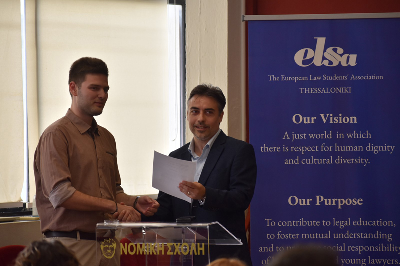 Την τιμητική διάκριση απέδωσε ο Επίκουρος Καθηγητής Δημοσιονομικού Δικαίου και Ε.Ο.Δ., Στυλιανός Μαυρίδης, Μέλος του Διοικητικού Συμβουλίου της Ένωσης Ελλήνων Δημοσιολόγων, παρουσία και άλλων επισήμων καλεσμένων εκ του Δικηγορικού Συλλόγου Θεσσαλονίκης και του Αριστοτελείου Πανεπιστημίου.