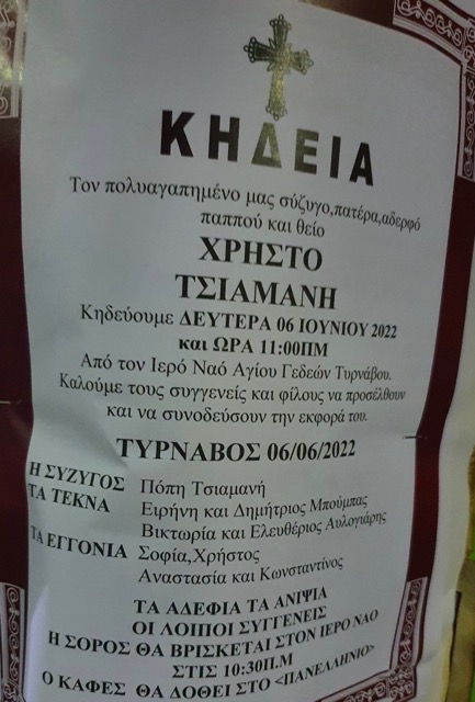 Η κηδεία θα τελεστεί την Δευτέρα 6 Ιουνίου 2022 και ώρα 11:00 π.μ. στον Ιερό Ναό του Αγίου Γεδεών Τυρνάβου.