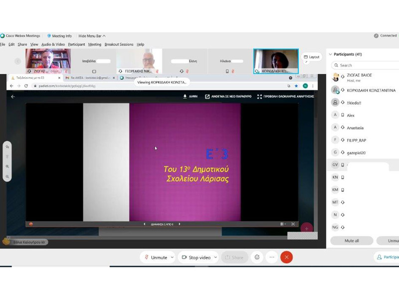 Την Παρασκευή 19 Μαρτίου πραγματοποιήθηκε η 1η τηλεδιάσκεψη γνωριμίας των δύο σχολείων, του 2ου Δημοτικού Σχολείου Τυρνάβου και του 13ου Δημοτικού Σχολείου Λάρισας. Συμμετείχαν οι μαθητές της ΣΤ τάξηςκαι του Ε3 αντίστοιχα, οι εκπαιδευτικοί Βάιος Ζιώγας, Κωνσταντίνα Κορκιδάκη και Νικόλαος Γεωργάκη, οι διευθυντές Ναυσικά Κουλαξίδου και Αστέριος Σίμος. Η πρώτη ψηφιακή συνάντηση των μικρών συνοδοιπόρων έγινε μέσα σε κλίμα ενθουσιασμού και αισιοδοξίας!