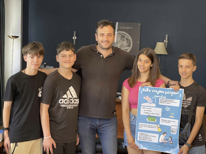 Στο πλαίσιο του περιβαλλοντικού προγράμματος «Τρέχει, τρέχει… το νερό», μαθητές και μαθήτριες της περιβαλλοντικής ομάδας του 2ου Γυμνασίου Τυρνάβου επισκέφθηκαν το Δημαρχείο της πόλης και παρέδωσαν στον Δήμαρχο Τυρνάβου Στέλιο Τσικριτσή τον Οικοκώδικά τους- έναν συμβολικό και ουσιαστικό κώδικα αξιών, στόχων και δράσεων για τη σωστή διαχείριση και εξοικονόμηση του νερού.