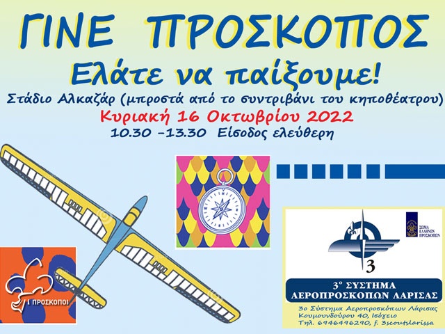 Το 3ο Σύστημα Αεροπροσκόπων Λάρισας διοργανώνει open day με τίτλο «Γίνε Πρόσκοπος» την Κυριακή 16 Οκτωβρίου και σας προσκαλεί να γνωρίσετε την μεγαλύτερη εθελοντική παιδαγωγική κίνηση για νέους στην Ελλάδα και τον κόσμο.