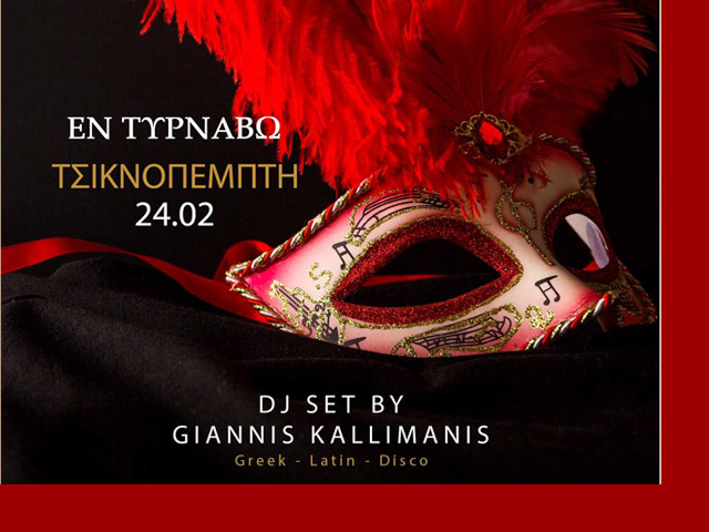 Στις 24 Φεβρουαρίου το Εν Τυρνάβω οργανώνει το πιο χορευτικό πάρτι της πόλης, με ελληνική, λάτιν και ντίσκο μουσική από τον DJ Giannis Kallimanis.