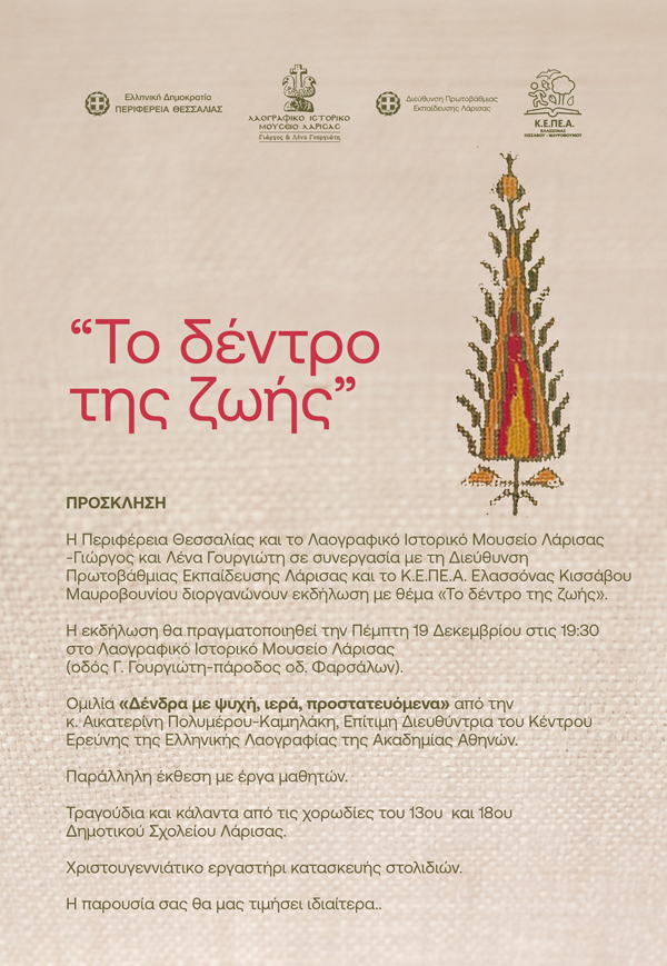 Η Περιφέρεια Θεσσαλίας και το Λαογραφικό Ιστορικό Μουσείο Λάρισας – Γιώργος και Λένα Γουργιώτη σε συνεργασία με την Διεύθυνση Πρωτοβάθμιας Εκπαίδευσης Λάρισας και το ΚΕΠΕΑ Ελασσόνας, Κισσάβου, Μαυροβουνίου διοργανώνουν εκδήλωση με θέμα «Το δέντρο της ζωής».