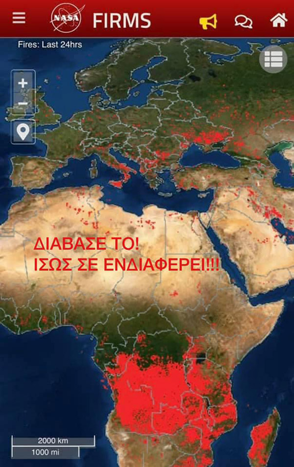Η παραπάνω φωτό είναι από τη NASA και απεικονίζει τι συμβαίνει σήμερα σε ΠΡΑΓΜΑΤΙΚΟ ΧΡΟΝΟ στον πλανήτη από ενεργά μέτωπα πυρκαγιάς .