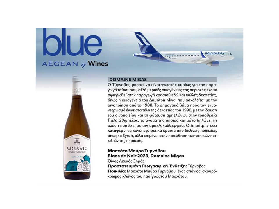 Το αγαπημένο κρασί του Κτήματος, Μοσχάτο Μαύρο Τυρνάβου είναι στην Aegean Wine List, τη λίστα των επιλεγμένων ποιοτικών ετικετών κρασιού που προσφέρονται στις πτήσεις της AEGEAN και στα Aegean Business Lounges.