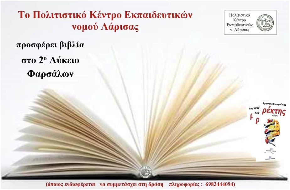 Το Πολιτιστικό Κέντρο Εκπαιδευτικών νομού Λάρισας – ΠΟΚΕΛ θα προσφέρει βιβλία στο 2ο Γενικό Λύκειο Φαρσάλων, μετά από πρόσκληση του διευθυντή Γιώργου Κουτσοδόντη, του Συλλόγου Διδασκόντων και της Πανωραίας Ευθυμίου, συντονίστριας της δράσης “Βιβλιο – ταξιδεύουμε: Ανακαλύπτοντας κόσμους Γνώσης και Φαντασίας …”, στο πλαίσιο της αξιολόγησης εκπαιδευτικού έργου σχολικών μονάδων (ως συνέχεια της περσινής δράσης:: “Όσο ζω διαβάζω – όσο ζω μαθαίνω / Δημιουργία Βιβλιοθήκης”).