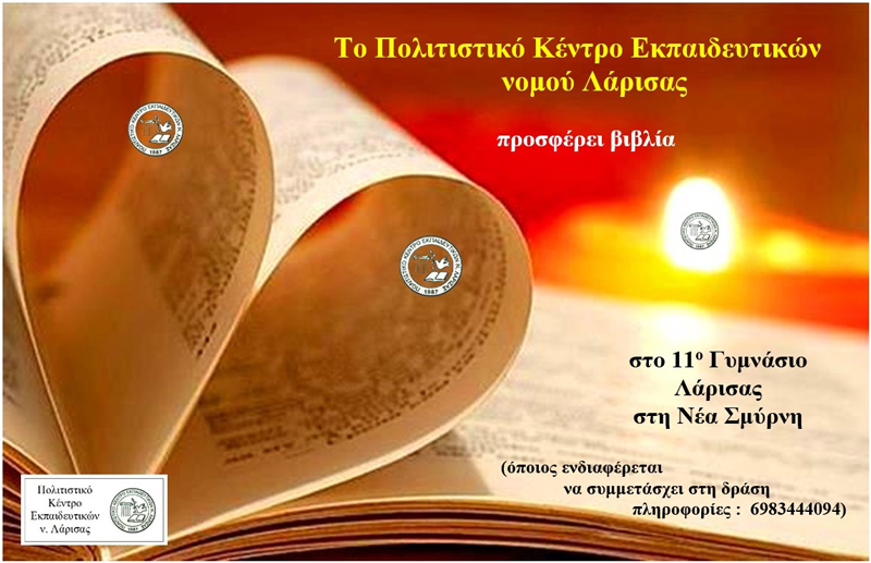 Το Πολιτιστικό Κέντρο Εκπαιδευτικών νομού Λάρισας – ΠΟΚΕΛ προσφέρει βιβλία στο 11ο Γυμνάσιο Λάρισας, στη Νέα Σμύρνη, μετά από πρόσκληση της διευθύντριας Κακαρόντζα Ευαγγελίας και του Συλλόγου Διδασκόντων για την ενίσχυση της σχολικής βιβλιοθήκης και της φιλαναγνωσίας των μαθητών του σχολείου.