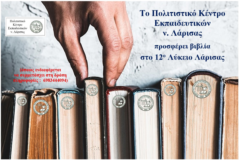 Το Πολιτιστικό Κέντρο Εκπαιδευτικών νομού Λάρισας – ΠΟΚΕΛ προσφέρει βιβλία στο 12ο Λύκειο Λάρισας, μετά από πρόσκληση του διευθυντή Βαγγέλη Τασιόπουλου και του Συλλόγου Διδασκόντων, προκειμένου να εμπλουτισθεί η σχολική βιβλιοθήκη με νέους τίτλους βιβλίων.