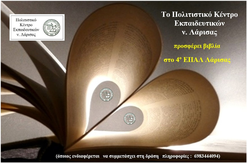 Το Πολιτιστικό Κέντρο Εκπαιδευτικών νομού Λάρισας – ΠΟΚΕΛ προσφέρει βιβλία στο «4ο ΕΠΑΛ Λάρισας – Τάκης και Φιλόλαος Τλούπας», μετά από πρόσκληση της διευθύντριας Χριστίνας Ηλιάδη και του Συλλόγου Διδασκόντων προκειμένου να εμπλουτισθεί η σχολική βιβλιοθήκη με νέους τίτλους βιβλίων, που αφορούν τις ειδικότητες του σχολείου.