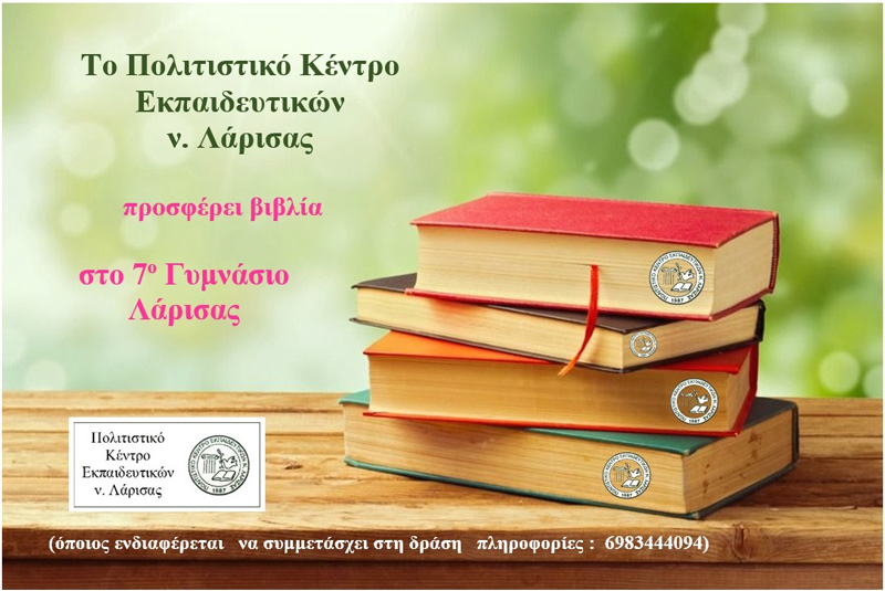 Το Πολιτιστικό Κέντρο Εκπαιδευτικών νομού Λάρισας – ΠΟΚΕΛ θα προσφέρει βιβλία στο 7ο Γυμνάσιο Λάρισας μετά από πρόσκληση της διευθύντριας Αργυρώς Γκαραγκούνη, του Συλλόγου Διδασκόντων και πρωτοβουλία της εκπαιδευτικού Μαριέττας Χαρταλάμη, προκειμένου να εμπλουτισθεί η σχολική βιβλιοθήκη με νέους τίτλους βιβλίων.