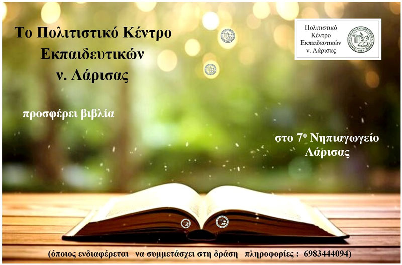 Το Πολιτιστικό Κέντρο Εκπαιδευτικών νομού Λάρισας – ΠΟΚΕΛ προσφέρει βιβλία στο 7ο Νηπιαγωγείο Λάρισας, προκειμένου να εμπλουτισθεί η βιβλιοθήκη του, μετά από πρόσκληση της προϊσταμένης, Μυριούνη Ευγενίας.