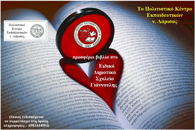 Το Πολιτιστικό Κέντρο Εκπαιδευτικών νομού Λάρισας – ΠΟΚΕΛ προσφέρει βιβλία στο Ειδικό Δημοτικό Σχολείο Γιάννουλης, μετά από πρόσκληση της διευθύντριας Σοφίας Λιθοξοπούλου και του Συλλόγου Διδασκόντων, για να εμπλουτισθεί η σχολική βιβλιοθήκη με νέους τίτλους βιβλίων.