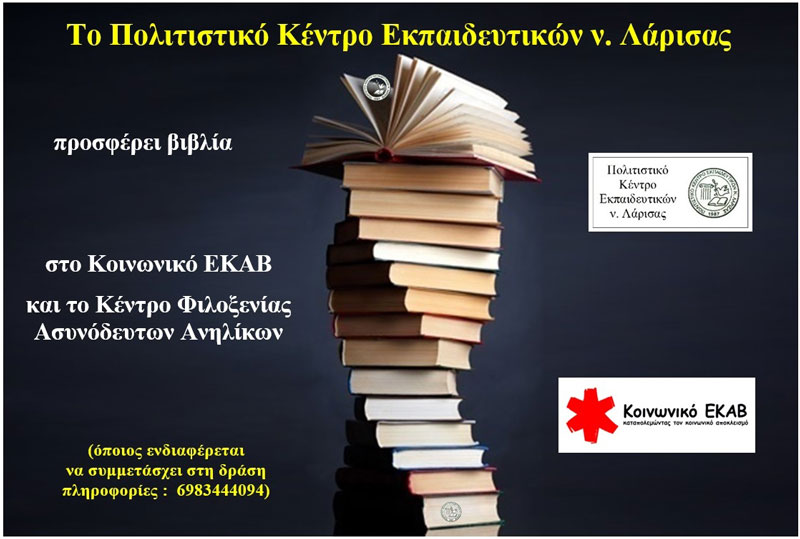 Το Πολιτιστικό Κέντρο Εκπαιδευτικών νομού Λάρισας – ΠΟΚΕΛ προσφέρει βιβλία   στο «Κοινωνικό ΕΚΑΒ», Κέντρο Φιλοξενίας Ασυνόδευτων Ανηλίκων «Καλλίστη 3», το οποίο εξασφαλίζει στέγαση, σίτιση, ιατροφαρμακευτική φροντίδα, ψυχοκοινωνική υποστήριξη, επιμόρφωση, ψυχαγωγία και νομική υποστήριξη στα φιλοξενούμενα προσφυγόπουλα. Το ΠΟΚΕΛ θα προσφέρει ελληνόφωνα κι αγγλόφωνα βιβλία, προκειμένου να εμπλουτισθεί η υπάρχουσα βιβλιοθήκη κι έτσι οι ανήλικες ασυνόδευτοι πρόσφυγες να κατανοήσουν πιο πολύ τον πολιτισμό του τόπου στον οποίο διαμένουν.