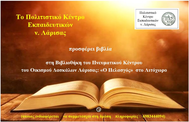 Το Πολιτιστικό Κέντρο Εκπαιδευτικών νομού Λάρισας – ΠΟΚΕΛ προσφέρει βιβλία στον Οικισμό Δασκάλων Λάρισας «Ο Πελασγός» στο Λιτόχωρο, μετά από πρόσκληση του προέδρου, Θανάση Δρυστέλλα και του Διοικητικού Συμβουλίου και με πρωτοβουλία του ιδρυτή του μοναδικού οικισμού «Πελασγός» Δημήτρη Καραμούρτου, ο οποίος έχει κάνει στη νεοϊδρυθείσα βιβλιοθήκη την 1η προσφορά 325 βιβλίων, συμβολίζοντας έτσι την 1η Οικουμενική Σύνοδο κατά των αιρέσεων.