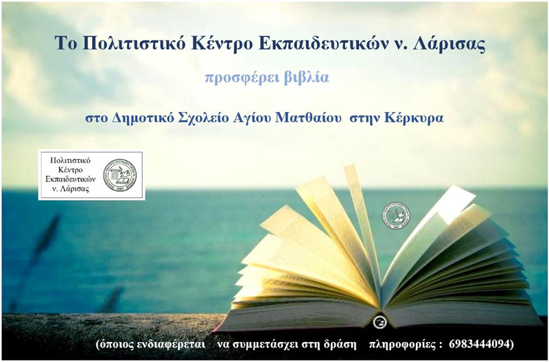 Το Πολιτιστικό Κέντρο Εκπαιδευτικών νομού Λάρισας – ΠΟΚΕΛ προσφέρει βιβλία στο Δημοτικό Σχολείο Αγίου Ματθαίου στην Κέρκυρα, ώστε να εμπλουτισθεί η σχολική βιβλιοθήκη, που δημιουργήθηκε πρόσφατα, με νέους τίτλους βιβλίων, μετά από πρωτοβουλία του εκπαιδευτικού από τον Τύρναβο, Νικόλα Μάρκου και πρόσκληση της διευθύντριας, Ζαχαρούλας Τρατολού.